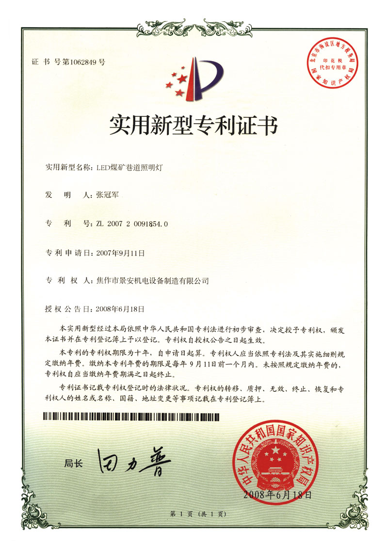 LED煤礦巷道照明燈專(zhuān)利證書(shū)1